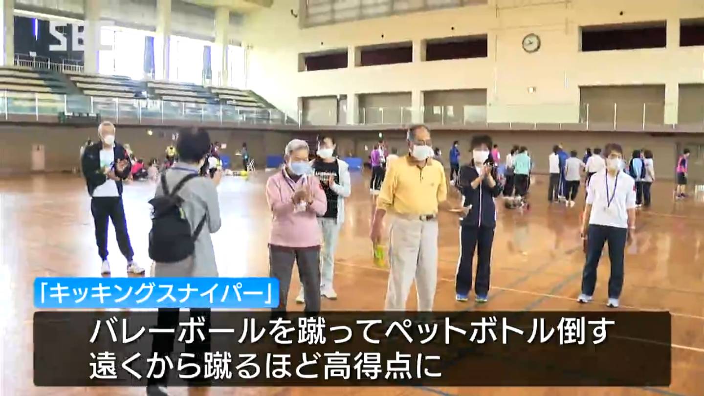 バレーボールを蹴ってペットボトルのピンを倒す、ボーリングに似た競技は、遠くから蹴るほど得点が高くなるルールで、参加者は自分の実力に合わせて楽しんでいました。