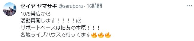 また、ヴォーカルのヤマサキセイヤさんも自身のX(旧ツイッター)を更新し、「10/9帯広から活動再開します!!!! サポートベースは旧友の木原!!! 各地ライブハウスで待ってます」と、炎の絵文字を合わせて投稿しています。