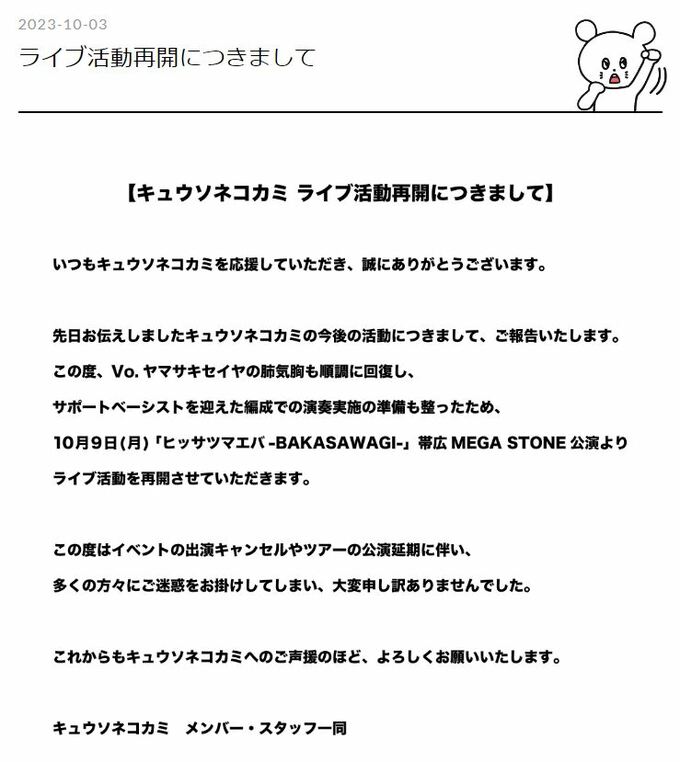 公式サイトでは「この度、Vo.ヤマサキセイヤの肺気胸も順調に回復し、サポートベーシストを迎えた編成での演奏実施の準備も整ったため、10月9日(月)『ヒッサツマエバーBAKASAWAGI-』帯広 MEGA STONE 公演より ライブ活動を再開させていただきます。」と報告されました。