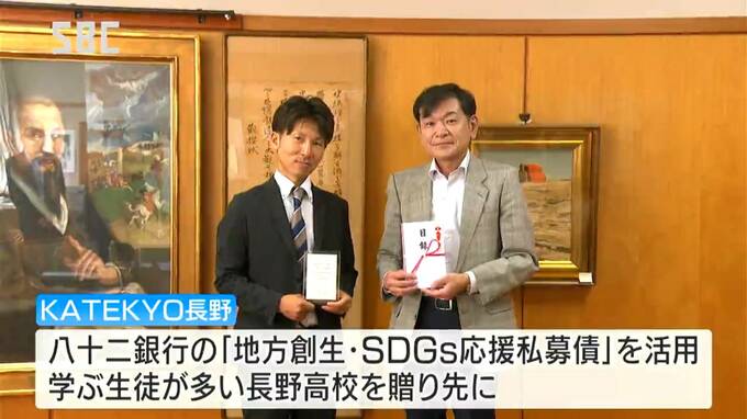寄贈は、少数の投資家を募る社債=私募債の発行に際して、手数料の割引き分を地域への寄付に充ててもらう、八十二銀行の制度を活用したもので、KATEKYO長野では、塾などで学ぶ生徒が多いことから、お礼の意味を込めて長野高校を贈り先に選んだということです。