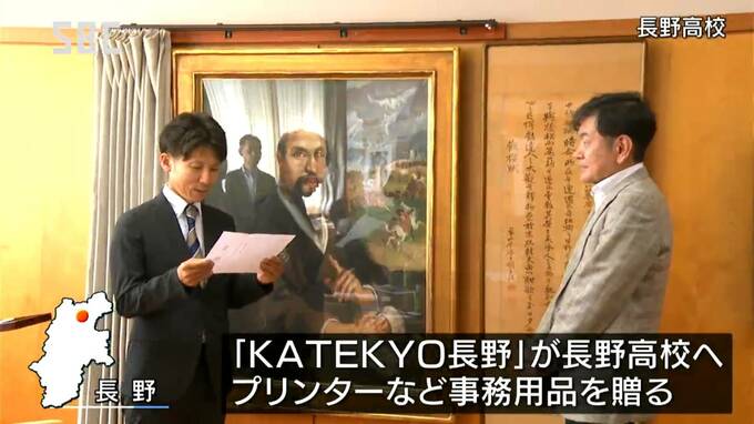 寄贈したのは長野市に本部があり、家庭教師の派遣や学習塾の運営を行っている「KATEKYO長野」で、古村茂樹(こむら・しげき)社長から長野高校の廣田昌彦(ひろた・まさひこ)校長にプリンターなどの事務用品の目録が渡されました。