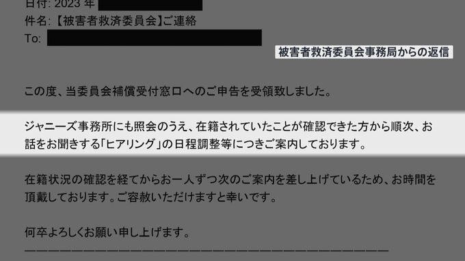 「ジャニーズ事務所にも照会のうえ、在籍されていたことが確認できた方から順次、お話をお聞きする『ヒアリング』の日程調整等につきご案内しております」
