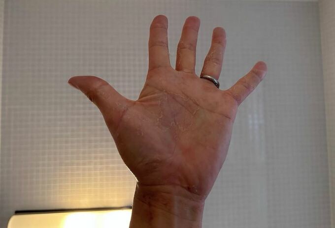 つるのさんは、自身の左手の平を大きく広げた写真と共に「今年は初めて手の平に『汗疱』という謎の症状が。」と投稿。写真の手の平は乾いて皮がむけたような状態になっています。