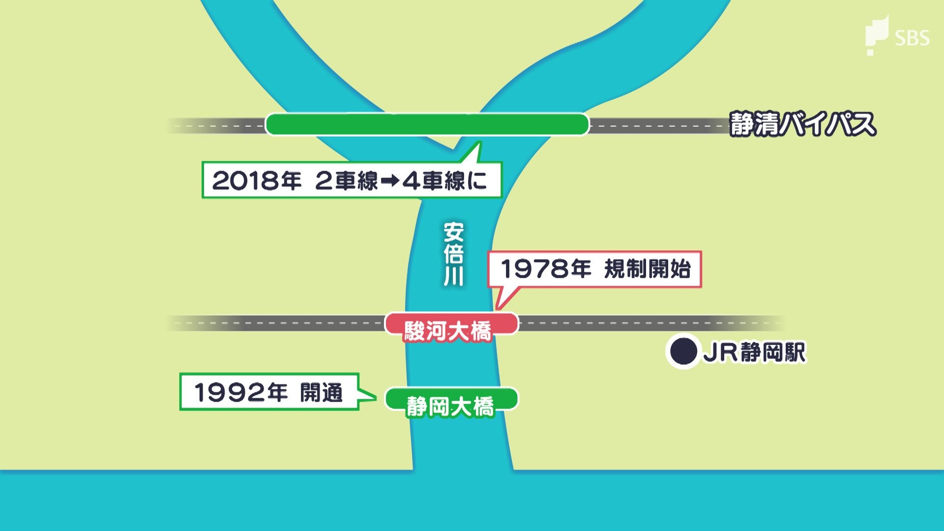 1992年に静岡大橋が開通。さらに、2018年には、国道1号静清バイパスが全線4車線化するなど、規制導入時に比べて道路の選択肢が増えたことで交通量は分散。駿河大橋の交通量はピーク時の1985年と比べると4割ほど減少しました。