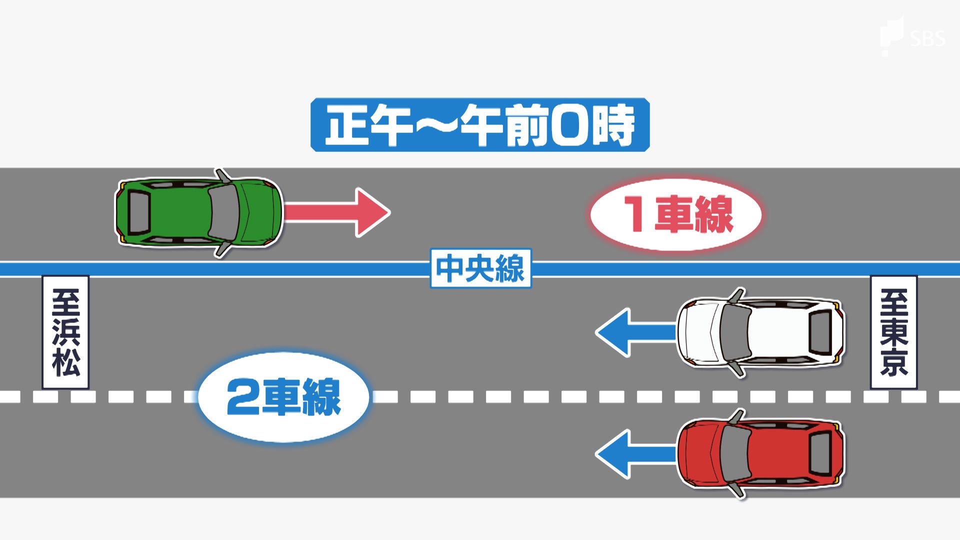 駿河大橋では、午前0時から正午までは、交通量が多い上りが2車線。正午から午前0時は下りが2車線となります。