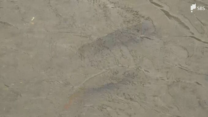 白く濁った水から、亀が顔をのぞかせています。生き物への影響はないということでしょうか。