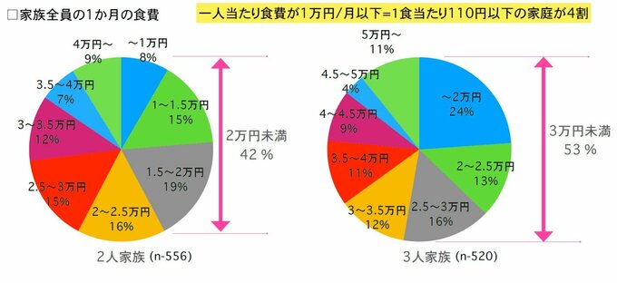 家族全員の一か月の食費も2人家族で2万円未満が42%、3人家族で3万円未満が53%と、一人1食当たり110円以下の家庭が4割を超えています。モノの値段が上がり続ける中、「もともと最低限で暮らしていたので、これ以上削れるところがない」といった悲鳴も届いています。