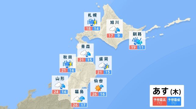 東北日本海側では雷を伴った強い雨が降り大雨となる所がある見込み。
