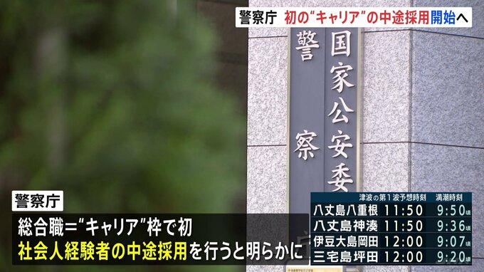 警察庁は、総合職いわゆる“キャリア”の枠で、初めて、社会人経験者の中途採用を行うことを明らかにしました。新卒では採用できない多様な経験や能力のある人の獲得を目指す狙いで、社会人経験が7年以上ある人は…