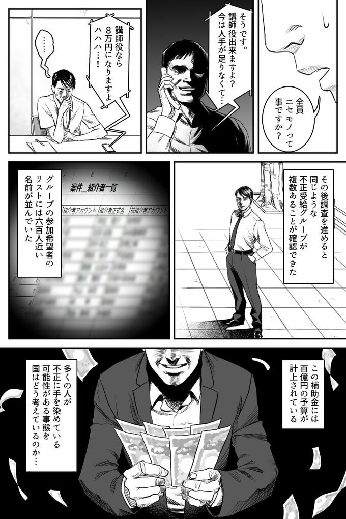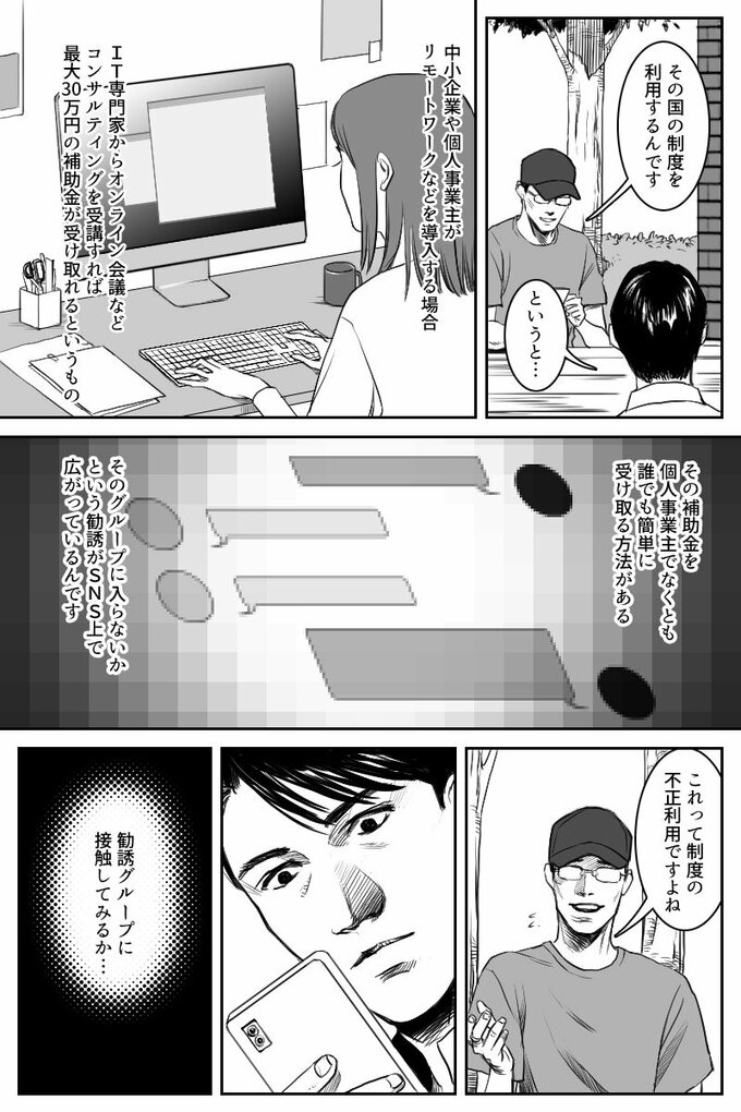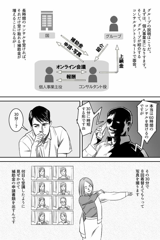 コミック DIG 「8回着替えて5万円」狙われた100億円規模のコロナ対策補助金「デジタル化応援隊事業」【コミックDIG #1】 TBSテレビ 2022年6月24日(金) 00:00 国内 NEWS DIG編集部 SNSで拡散する「リモート会議で8回服を着替えれば、誰でも5万円受け取れる」という謎の書き込み。コロナ対策などの100億円規模の補助金をめぐり、大がかりな不正が行われている疑惑が独自取材で浮上しました。TBSテレビ報道局「調査報道ユニット」の村瀬健介記者が徹底追跡します。(※2021年9月オンエアをもとに再構成しています) つづきを読む === 調査報道ユニットに関する記事はこちら