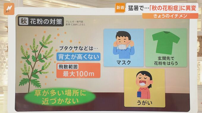 ブタクサなどは背丈が高くないため飛散範囲は最大100メートルほどだそうです。対策としては草が多い場所に近づかない、マスクを着け、玄関先で花粉をはらい、うがいをすると良いそうです。