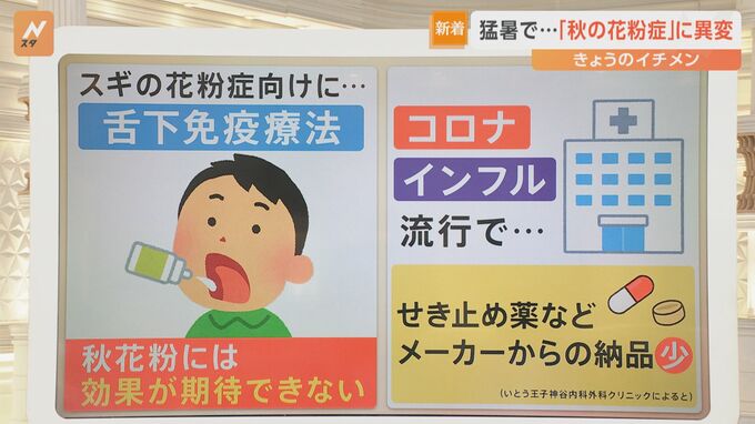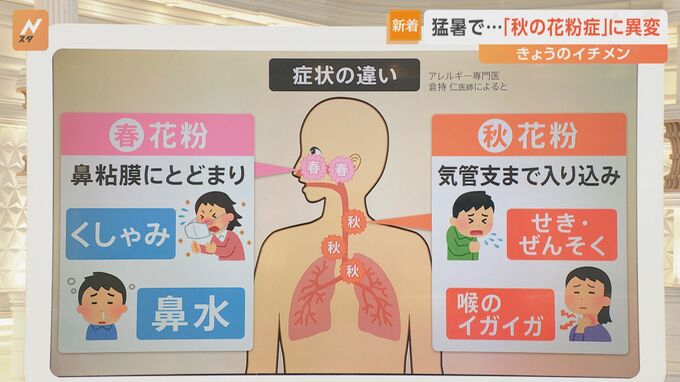 アレルギー専門医の倉持仁医師によりますと▼春の花粉は鼻の粘膜にとどまり、くしゃみ・鼻水などを引き起こし ▼秋の花粉は気管支まで入り込み、せき・ぜんそく、喉のイガイガなどの症状が出るそうです。