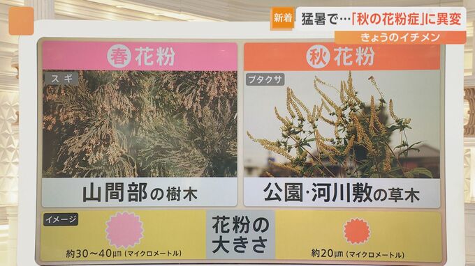 春と秋の花粉には違いがあります。▼春は山間部の樹木から出る花粉で大きさは約30~40マイクロメートル ▼秋は公園・河川敷の草木から出る花粉で大きさは約20マイクロメートルと、秋の花粉は春と比べて半分くらいのサイズになるそうです。