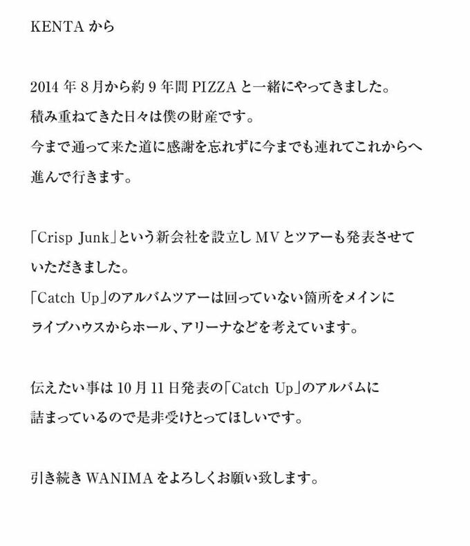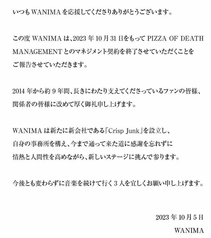 ファン・関係者への感謝の言葉を綴りつつ「WANIMA は新たに新会社である『Crisp Junk』を設立し、自身の事務所を構え、今まで通って来た道に感謝を忘れずに情熱と人間性を高めながら、新しいステージに挑んで参ります。」と宣言しています。