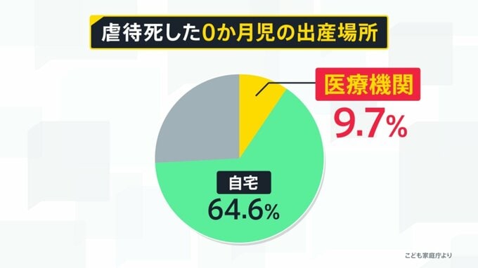 その赤ちゃんが出産された場所の内訳を見みると、▼自宅が64.6%。公的支援の一つである▼医療機関は9.7%と1割にも満たない。つまり、支援に繋がることができずに孤立出産をして、その先に虐待死があるケースが多いことがわかっているんです。