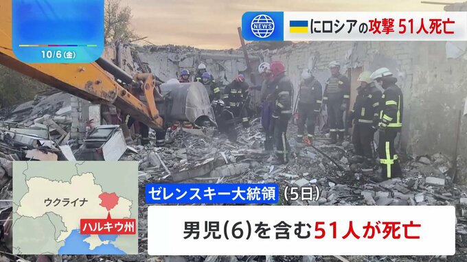 ウクライナ東部ハルキウ州でロシア軍による攻撃があり、6歳の子どもを含む51人が死亡しました。ゼレンスキー大統領は5日、東部・ハルキウ州クピャンスク地区の村でロシア軍によるミサイル攻撃があり、6歳の男の子…