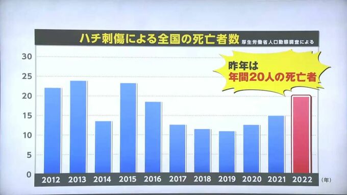 死亡する原因のほとんどは、アナフィラキシーショックによる血圧の低下や窒息など呼吸困難などで、昨年は全国でハチに刺されて20人が亡くなるなど多くの被害が報告されています。