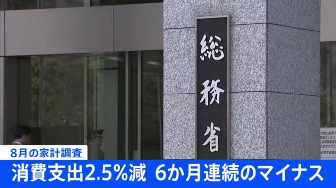 今年8月に2人以上の世帯が消費に使った金額は29万3000円あまりで、去年に比べて2.5%減少しました。総務省が発表した家計調査によりますと、今年8月の2人以上の世帯の消費支出は29万3161円で、去年8月に比べて実質で…