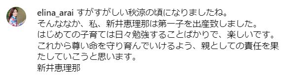新井さんは「すがすがしい秋涼の頃になりましたね。」と書き出し「そんななか、私、新井恵理那は第一子を出産致しました。」と赤ちゃんの写真を添えて、知らせました。