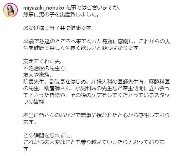 6日、フリーアナウンサーの宮崎宣子さん(44)が自身のインスタグラムを更新し、第一子となる男の子を出産したことを明かしました。