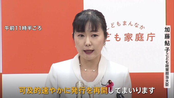 加藤こども政策担当大臣は、政府が発行を停止していたベビーシッターの利用割引券の配布を再開すると明らかにしました。加藤鮎子 こども政策担当大臣(午前11時半ごろ)「ベビーシッターを利用されている子育て世…