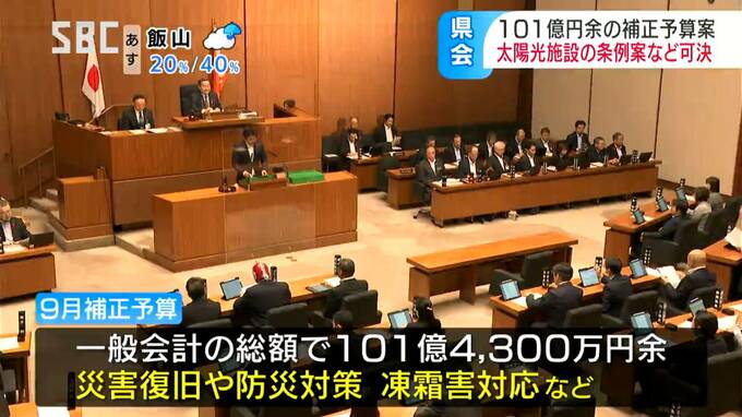 長野県議会の9月定例会は、災害対応を中心としたおよそ101億円の補正予算案や太陽光発電事業に関する条例案などを可決し閉会しました。