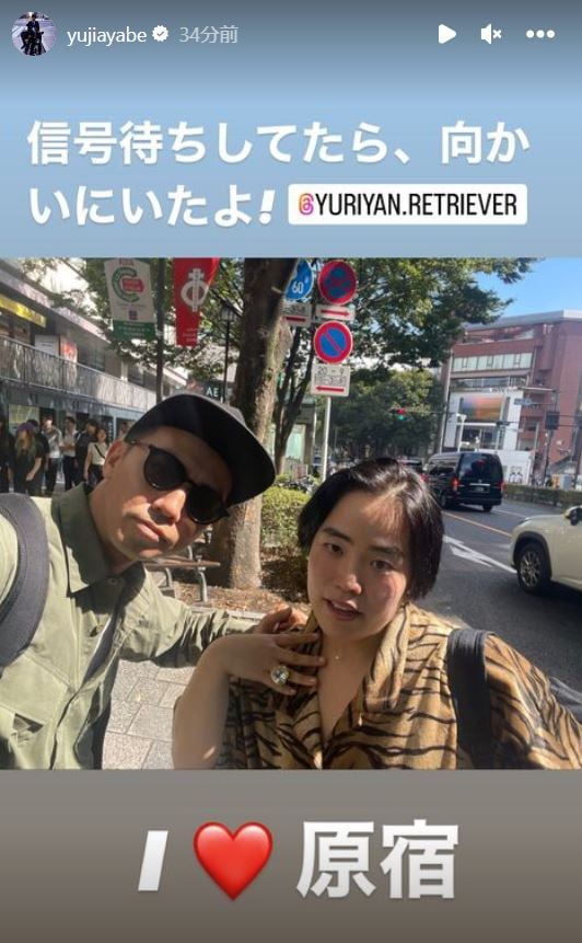 そしてストーリーズには「信号待ちしてたら、向かいにいたよ!」というテキストとともに、なんとゆりやんレトリィバァさんとの2ショット写真を投稿しており、「I♡原宿」と大きくテキストを入れています。