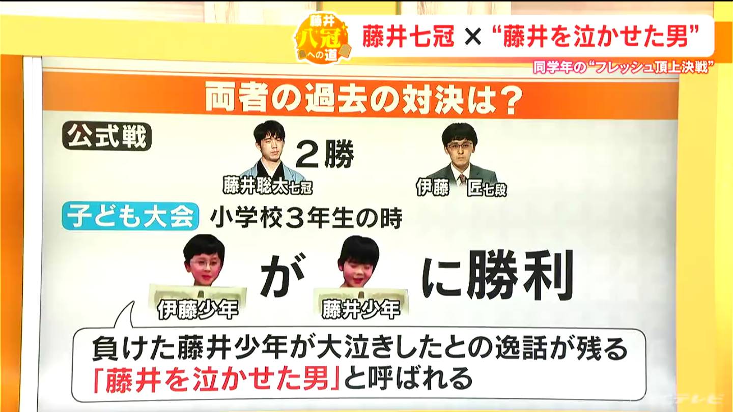 子どもの頃、小学校3年生のときです。伊藤少年が藤井少年に勝利してるんです。そのときに負けてしまった藤井少年が大泣きしてしまったという逸話も残っていて、伊藤少年は“藤井聡太を泣かせた男”と呼ばれているんです。