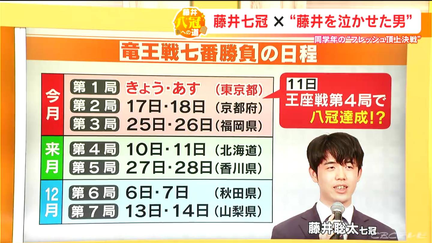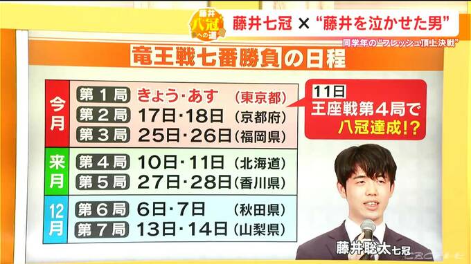 では竜王戦の日程を押さえておきましょう。持ち時間は8時間で2日制です。そして七番勝負ですから、先に4勝した方が竜王となるんですが、もつれると12月14日まで続くんですね。そんな中で、藤井七冠のスケジュールですが、今月11日に王座戦第4局で勝てば、八冠達成となります。