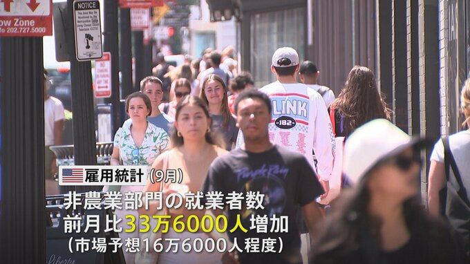 アメリカの先月の就業者数は市場の予想を大幅に上回り、33万6000人増加しました。市場では中央銀行にあたるFRB=連邦準備制度理事会が追加の利上げを行うとの見方が強まっています。アメリカ労働省が6日に発表した9…
