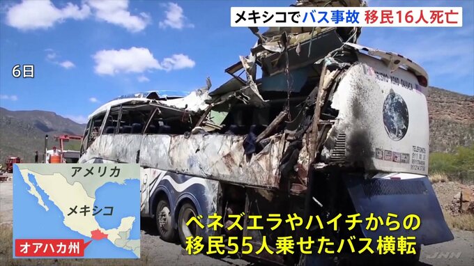 メキシコで移民を乗せたバスが横転し、少なくとも16人が死亡しました。AP通信によりますと、メキシコ南部オアハカ州で6日、ベネズエラやハイチからの移民55人を乗せていたバスが横転し、子ども3人を含む少なくとも1…