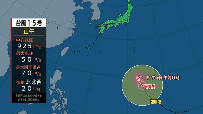 気象庁などによりますと、大型で猛烈な台風15号は勢力を維持して小笠原近海、その後は日本の東海上へ進む見込みだということです。