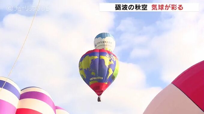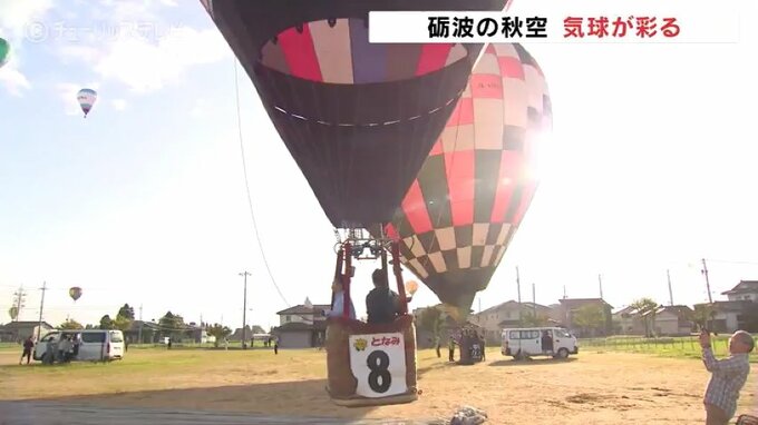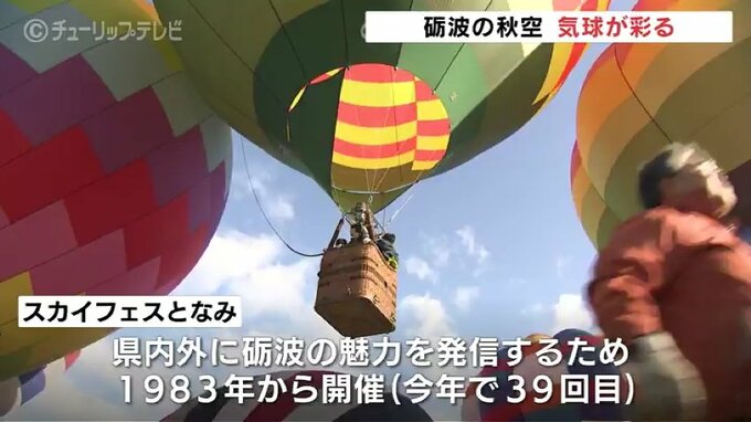 砺波の秋の風物詩「スカイフェスとなみ」が開かれました。熱した空気を送り気球を膨らませると一機ずつ空の旅へ出発!