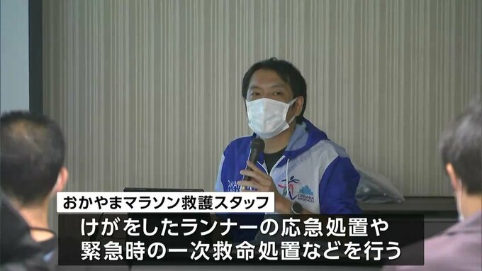 来月(11月)12日に開催される「おかやまマラソン2023」に向け、ランナーをけがや体調不良などから守る救護スタッフの説明会が開かれています。
