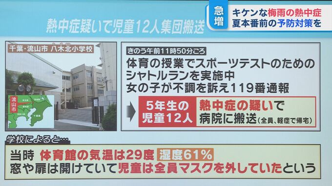 学校によると、授業は体育館で行われていて、窓や扉は開放し、児童も全員マスクを外していたといいますが、当時の体育館の気温は29度で湿度が61%だったということです。