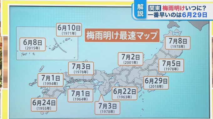 東海地方では、1963年に6月22日に梅雨明けという記録がある。関東では2018年、ものすごい猛暑だった年で、熊谷で41.1度が出た年が6月29日。その他の地方も7月の頭ぐらいに梅雨が明けていることもあるんです。