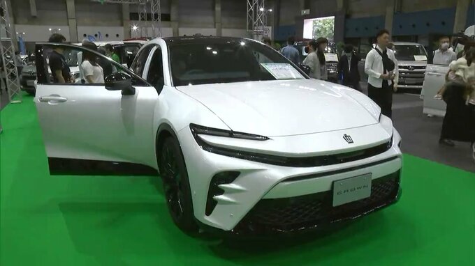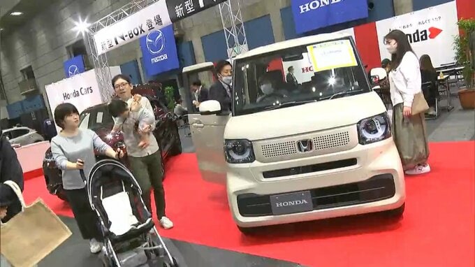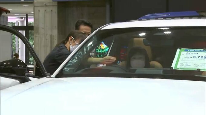 訪れた大勢の人はお目当ての車のシートに座ったり、販売員の説明に耳を傾けたりしながら車選びを楽しんでいました。