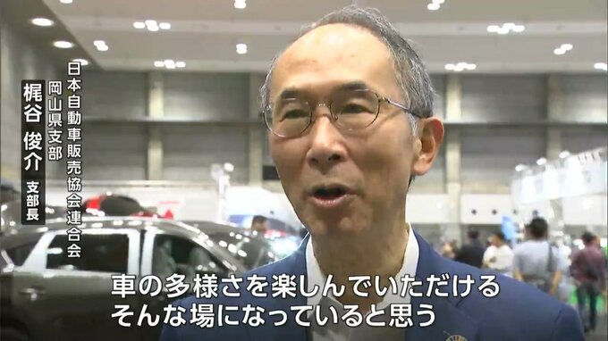 (日本自動車販売協会連合会 岡山県支部 梶谷俊介支部長)「今ある車、いろいろと見比べることができるというのが一番大きな意義じゃないかなと。車の多様さを楽しんでいただける。そんな場になっていると思います」
