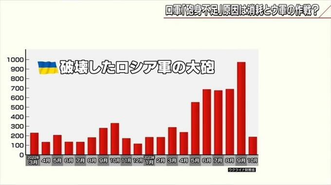 実際に衛星からでロシア内の基地を写した写真を分析すると戦前に152ミリ自走砲が298両あった駐機場に今年5月は155両に減っていて、そのうち砲身が残っている車両はわずか4両だけになっている。