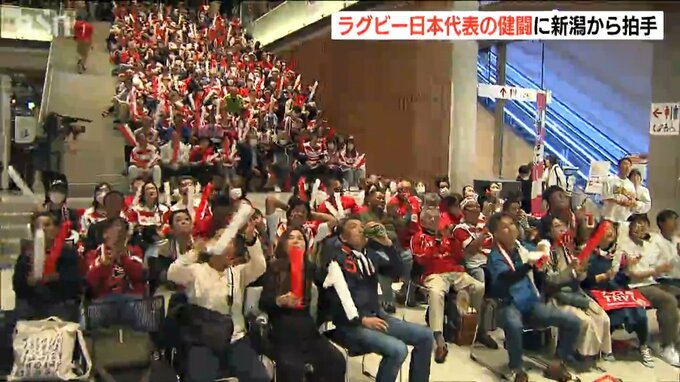 新潟市中央区のパブリックビューイング会場には、秋葉区出身の稲垣啓太選手ら日本代表を応援しようと、およそ230人が駆けつけ声援を送りました。