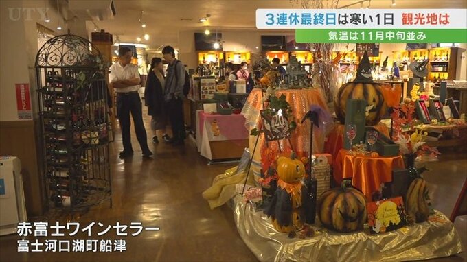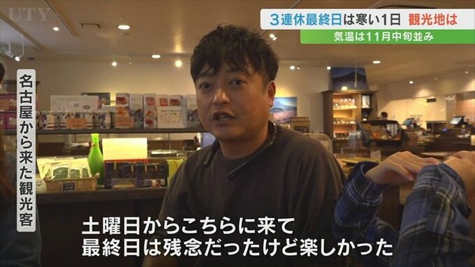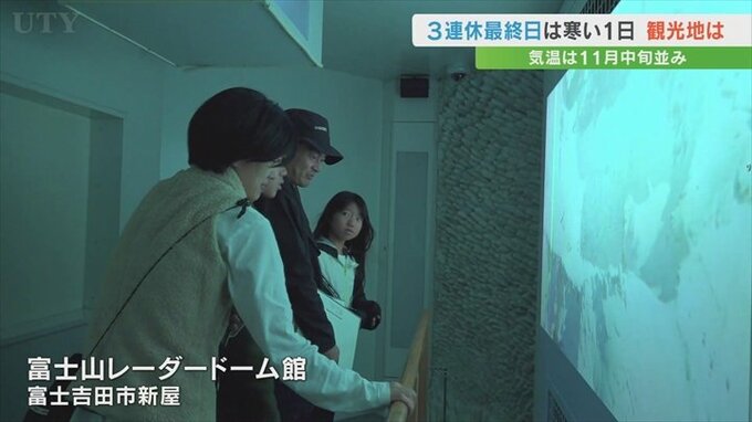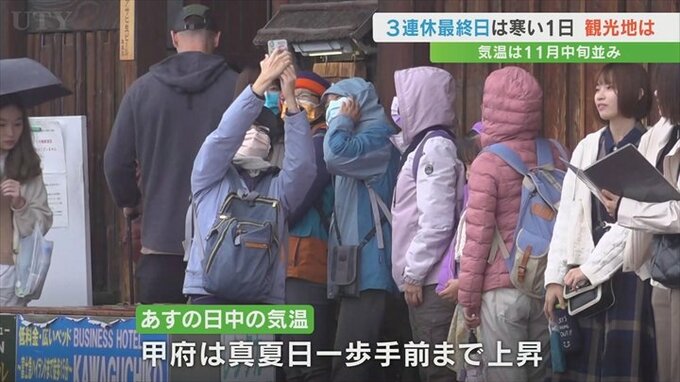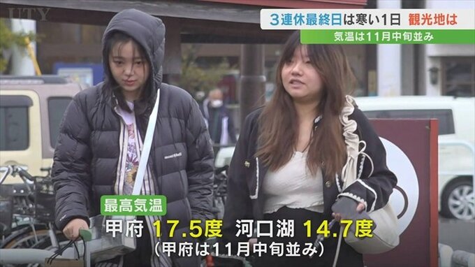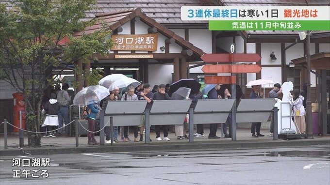 あいにくの天気となった3連休最終日。河口湖駅ではマフラーにダウンを着る人の姿も。