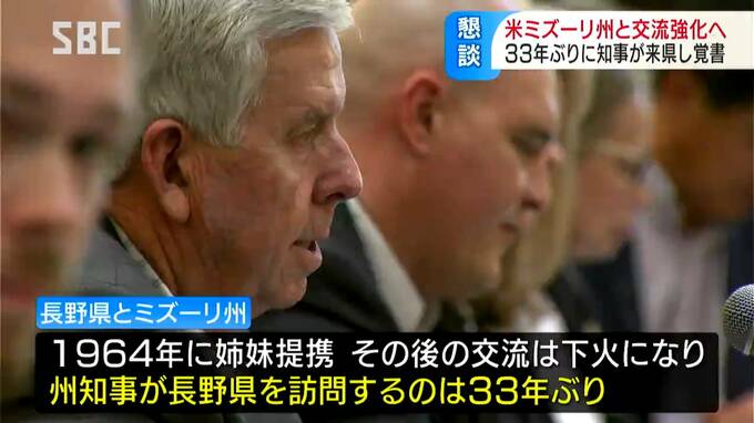 長野県と姉妹提携を結んでいるアメリカ・ミズーリ州の知事や幹部が長野市を訪れ、今後の交流を深める覚書を締結しました。