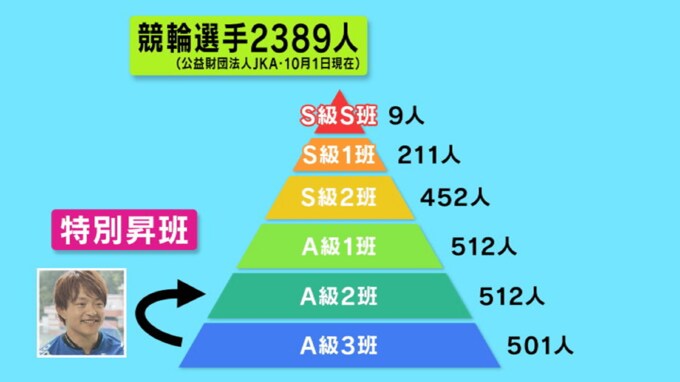 全国におよそ2400人いるプロの競輪選手。そのランクは、自身の成績が1年後に反映されるしくみです。ですので今年デビューした新人選手は、どんなに好成績を収めても上位に上がるのは翌年となるのが通常です。