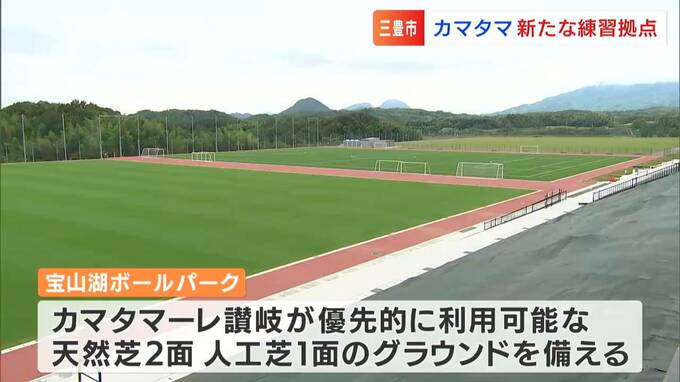 きょう(9日)から使用できるようになった宝山湖ボールパークです。カマタマーレ讃岐が三豊市と協力して整備したもので、優先的に使える練習場を含め、天然芝2面、人工芝1面のグラウンドを備えています。また、あわせて完成したクラブハウスは、チーム初の専用ロッカールームなども設置されていて、ネーミングライツにより「レクザム・カマタマーレ讃岐・クラブハウス」と決まりました。