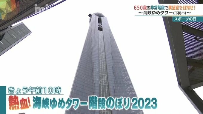 今日はスポーツの日。山口県内各地で様々なスポーツイベントが行われたのですが、わたし、永岡は関門海峡を一望できる、下関市の海峡ゆめタワーで、体を動かしてきました。永岡アナウンサー「海峡ゆめタワー4階の…
