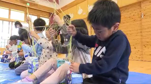 安曇野市で園児たちが牛乳パックを使った脱穀作業を体験しました。作業を体験したのは「有明(ありあけ)あおぞら認定こども園」の年長およそ30人で、園庭にある「ミニ田んぼ」で育てた稲を牛乳パックを使って脱穀…