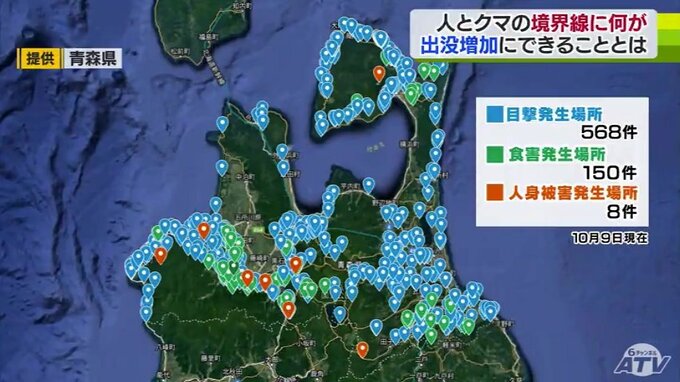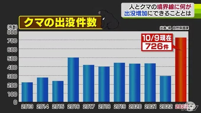 2023年、青森県内で確認されたクマの出没件数は9日までに726件と過去10年間で最も多く、去年1年間の約2.5倍となっています。米田所長は、その理由に猛暑のよるえさの減少を挙げています。