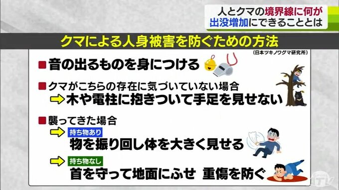 県内では人身被害も8件確認されています。米田所長は音の出る物を身に着けることや、こちらの存在に気づいていない場合は木や電柱などに抱きついて手足を隠し人間ではないように見せるとした一方で、襲って来た場合は物を振り回し体を大きく見せる。何も持っていなければ、首を守って地面に伏せ重傷を防ぐことが命を守ることに繋がるとしています。