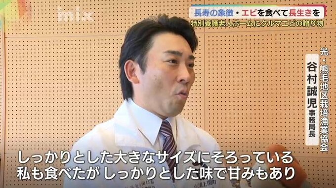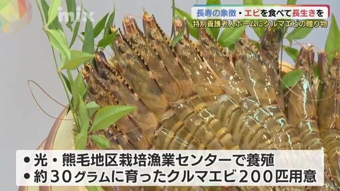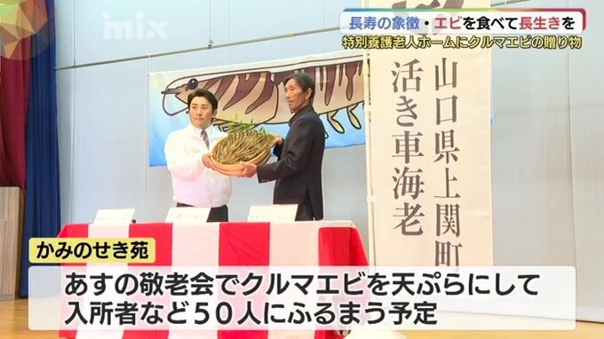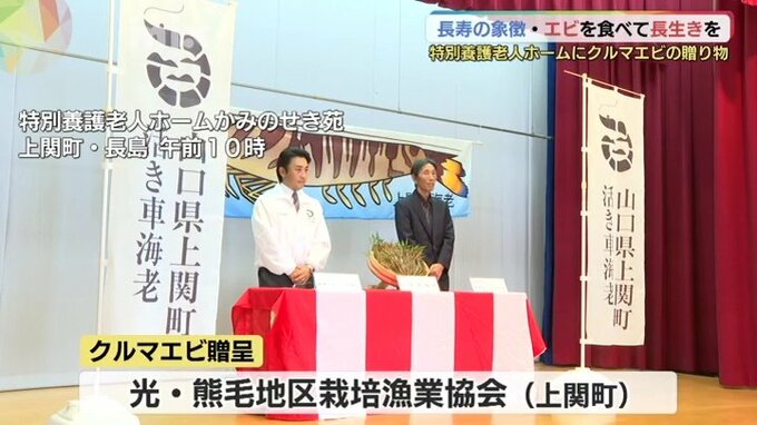お年寄りの長寿を願い、山口県上関町特産のクルマエビが地元の高齢者施設に贈られました。