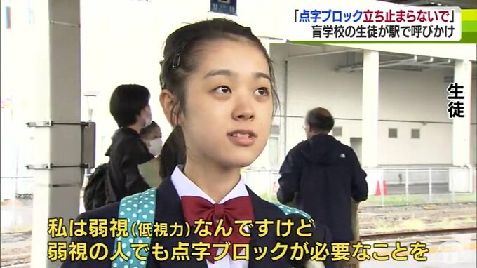 視覚障害者が一人で歩く際に補助となる視覚障害者誘導用ブロック=いわゆる「点字ブロック」。10日、青森県立盲学校の生徒たちが青森駅のホームで点字ブロックの役割について呼びかけました。河村庸市キャスター「…